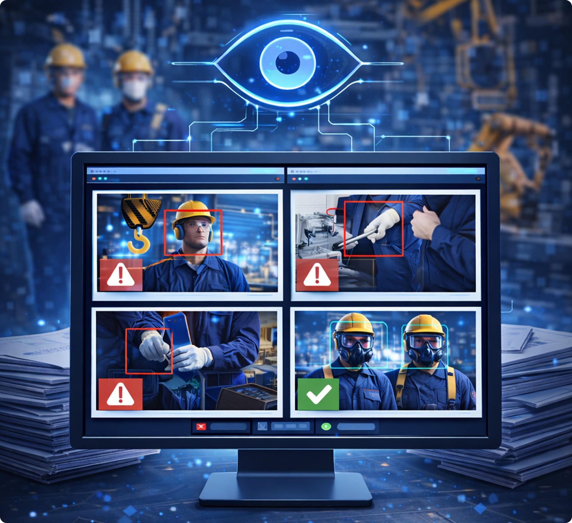 Обнаруживает типичные нарушения: отсутствие каски под кранами, работа без диэлектрических перчаток у электрооборудования, несоответствие СИЗ условиям (например, тканевые перчатки с химикатами). Анализирует позы, зоны риска и групповые фото, с точностью до 95% на стандартных сценариях промышленных объектов.